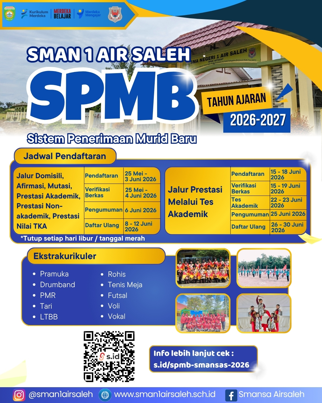 Selamat datang Calon Murid Baru (CMB)! SMA Negeri 1 Air Saleh resmi akan membuka Sistem Penerimaan Murid Baru (SPMB) untuk Tahun Ajaran 2026/2027. Pada tahun ini, SMAN 1 Air Saleh menyediakan kuota daya tampung sebanyak 180 murid yang akan dibagi ke dalam 5 Rombongan Belajar (Rombel).
